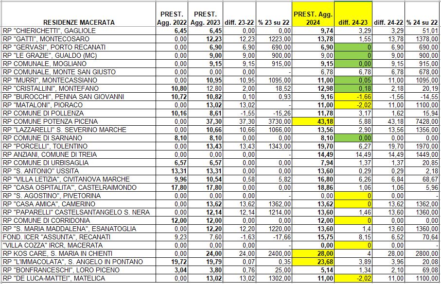Lo scorso 12 novembre l’AST Macerata ha pubblicato le singole convenzioni con le residenze protette riferite all’anno 2024, comprensive anche dell’allegato A2 che riporta le prestazioni aggiuntive a carico degli utenti, che si sommano alla retta base di 33 euro/giorno. Precedentemente, con la determina 505 del 26 settembre 2025 erano state approvate le convenzioni senza la compilazione, come nell’anno precedente, dell’allegato A2 (vedi la richiesta di chiarimenti del Gruppo Solidarietà). Da evidenziare come le convenzioni siano state approvate a settembre dell’anno successivo e quasi alla fine dell’anno pubblicate.
